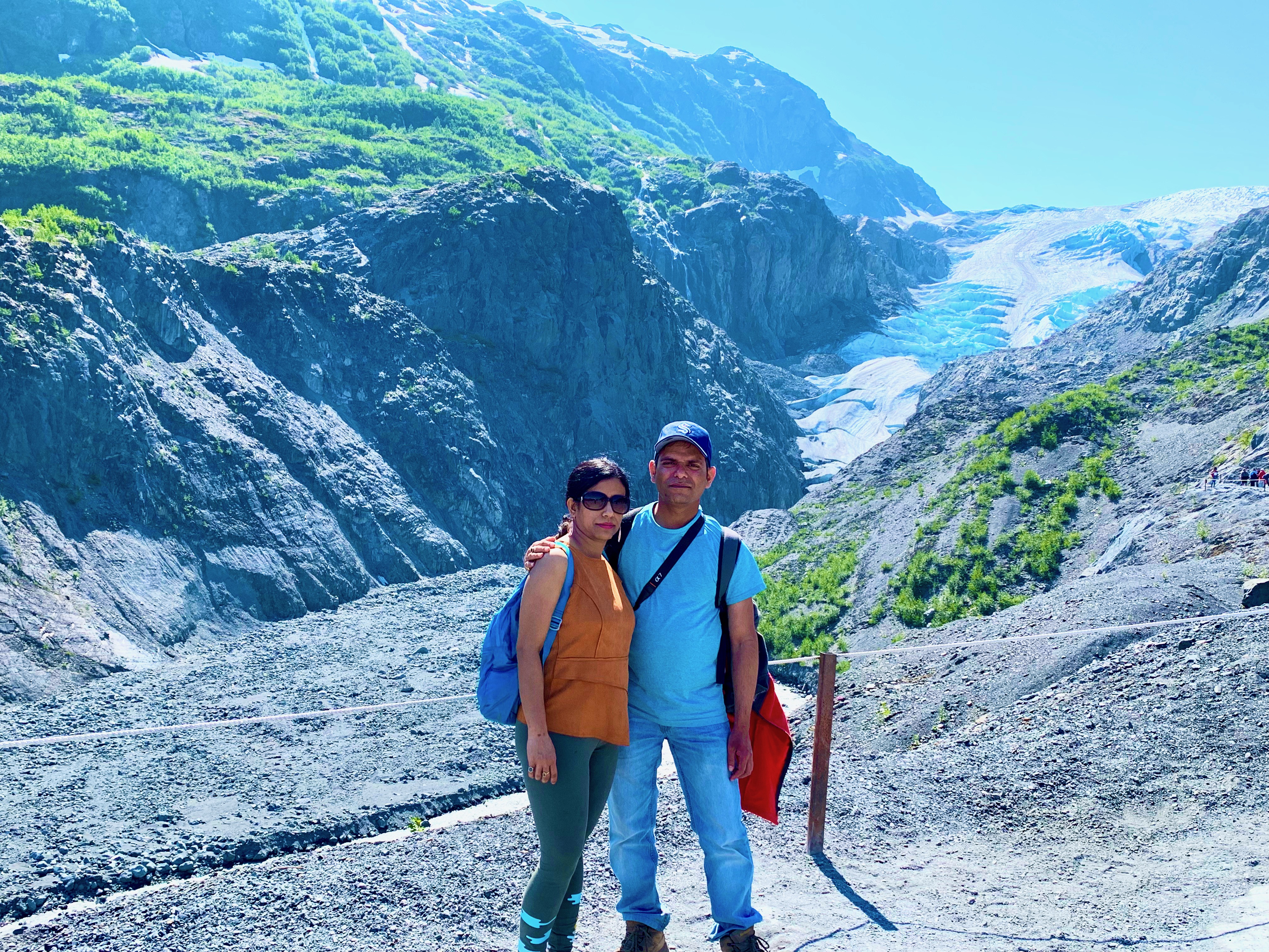 Today morning we drove more than one hour further through gravel road to reach Kennicott River footbridge. Car can’t be taken beyond this point, so we parked our car at paid parking spots and walked to cross the bridge. We had booked a full-day guided hiking tour with Stelia Guides and our guide was waiting for us on the other side of the river. They took us in a shuttle to the hiking point where they provided the hiking gears, shoe spike as we plan to hike on the glacier. We had a awesome guide along the way and believe it or not she is doing PhD in Glaciology. We had awesome views of the glaciers all around and the glacial terrains offered perfect spots for photos. Our guide arranged lunch, coffee and pure glacier water in the middle of our hike. I was looking for bear plunge in a glacier pool but could not find one in our journey. After experiencing what McCarthy has to offer, we resumed our drive to Valdez and we reached Valdez at night.