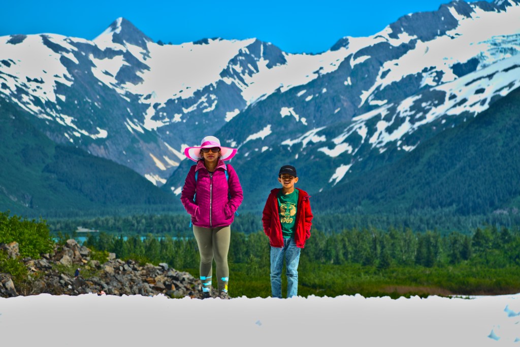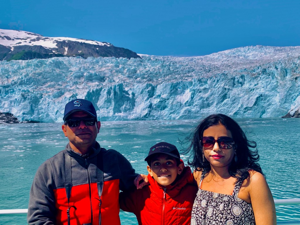 After having breakfast in our Airbnb, we started from Anchorage in morning and reached Seward by 12pm. Many people prefer to take the Alaska railroad which offers scenic view during the journey, but we preferred to drive. We took a hike to visit the Exit Glacier – one of the easy accessible glaciers in Alaska and can be done with smaller kids. The trail is about 10 minutes drive away from the city of Seward. One the way, there were signs marking years to show how the glaciers melted away over time. We witnessed craggy ice falling with cracking sound, rushing water. This Glacier (like most other glaciers in Alaska)is melting fast and may not be left for next generations. After the hike we returned to Seward to have dinner. We spent the night in a rented RV parked outside the residence of the owner of RV.