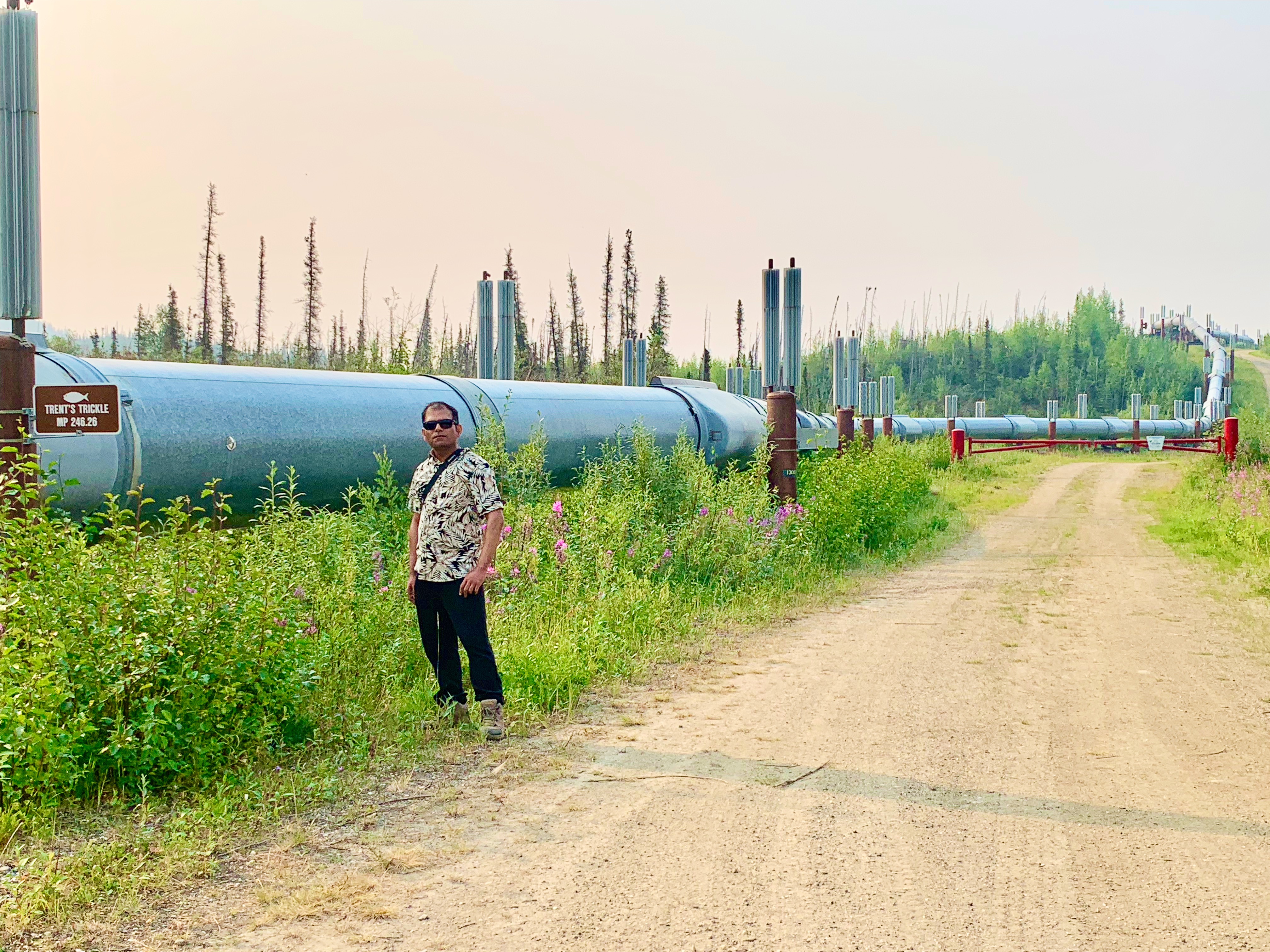 When we reached the famous Arctic Circle sign, we felt a sense of achievement as we have crossed the Arctic circle by road. We met an aged couple here who drove their RV all the way from Seattle to in this part of the globe. As we drove further, the visibility became bad as there was smoke and we could not get good view of the distant mountains. We saw the Trans Alaska Pipeline System, one of the world’s largest pipeline systems, about 800 miles long, delivering more than 500,000 barrels of oil per day from Prudhoe Bay to Valdez.