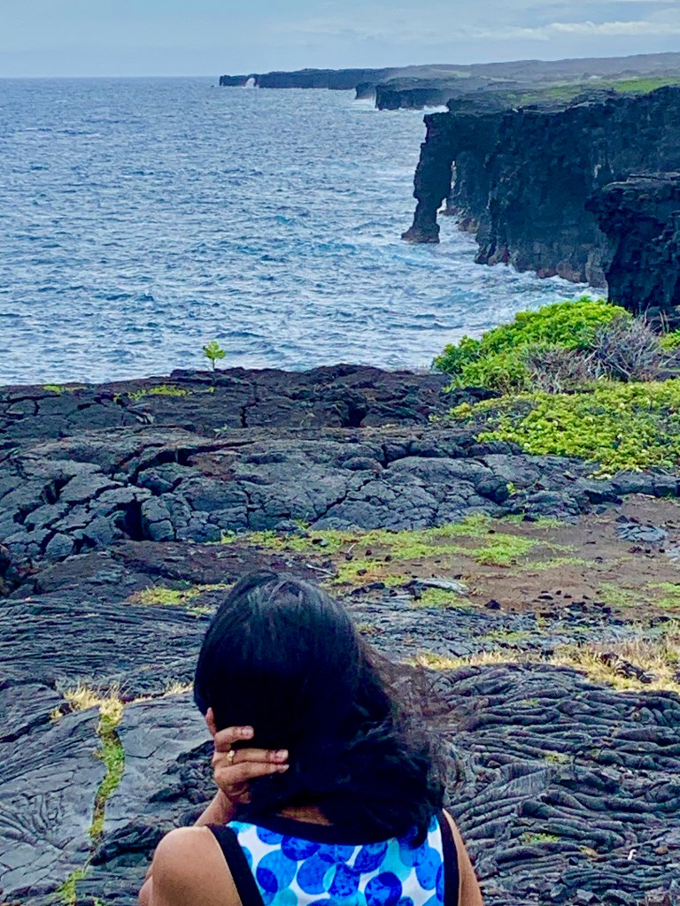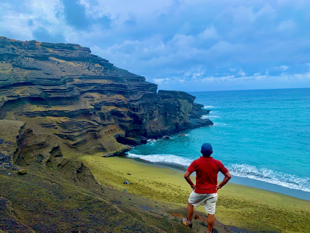We were thrilled to know that there are only 4 green sand beaches in the world. One of them is located here on the Big Island of Hawaii so we can not take miss it. It is a good and unique place to visit in the Big island. The Big Island Green Sand beach is near the southern tip of the Island. In addition to being surrounded by beautiful landscape, you will find warm, turquoise water where you can catch waves and enjoy swimming in this spectacular beach. However, getting into that beach is not quite easy. You can wither hike out to the Green Sand Beach from the parking lot. It’s about 3 miles, which is about 1 hour to walk from the parking lot to the beach. It could be very muddy in days when it rains, so prepare to wear proper mud shoes for this hike. You could get one of the 4WD truck services where they take you to the green sand beach from the parking lot. As soon as you pull into the parking lot, someone will approach you to ask if you want to head to the Green Sand Beach. They do charge about $10-20 for a round trip. But please remember that the ride is not going to be an easy one as the road is quite bumpy, jagged and slippery. So is it worth taking this trouble to visit Green sand Beach? Absolutely!
